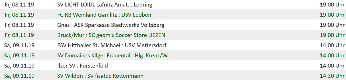 Landesliga, 15. Runde, FR 08.11.19, 19:00 Uhr. Weinland Stadion Gamlitz. FC Union RB Weinland Gamlitz : DSV Leoben. Schiedsrichterteam (Gruppe Süd): Lamb Markus, Paier Thomas, Kribernegg Josef.